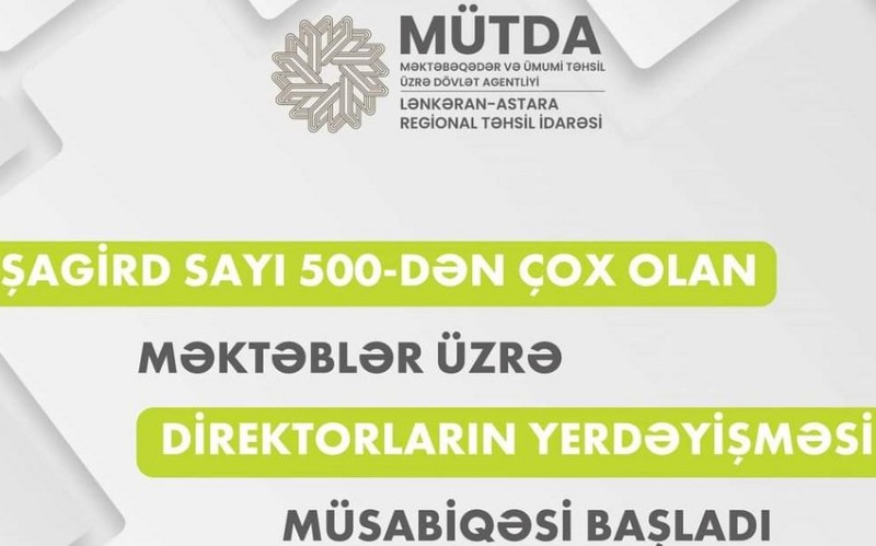 Lənkəran-Astara Regional Təhsil İdarəsinin tabeliyində fəaliyyət göstərən, şagird sayı 500-dən çox olan ümumi təhsil müəssisələrində vakant olan direktor vəzifələrinə yerdəyişmə prosesinə qeydiyyat başlayıb.