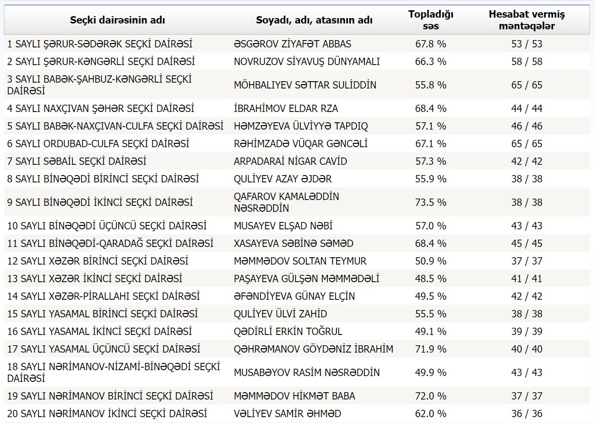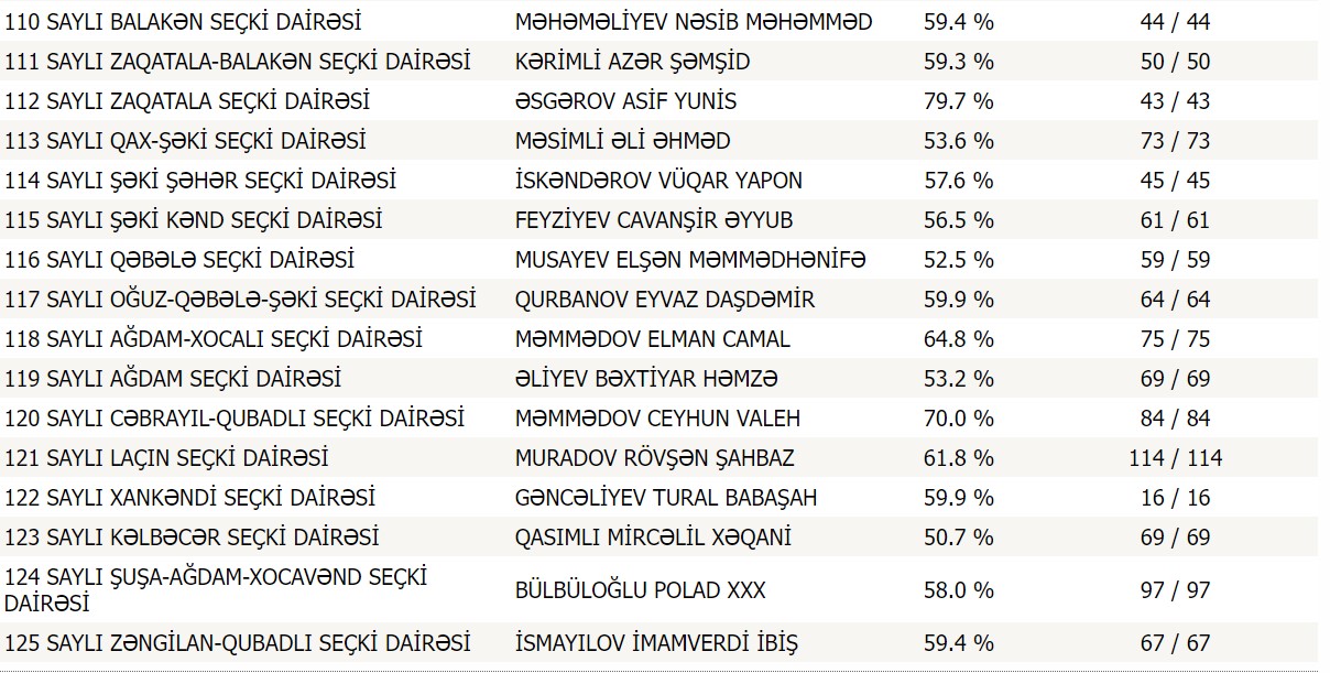 Azərbaycandakı seçki məntəqələrinin hamısı protokollarını Mərkəzi Seçki Komissiyasına təqdim edib.