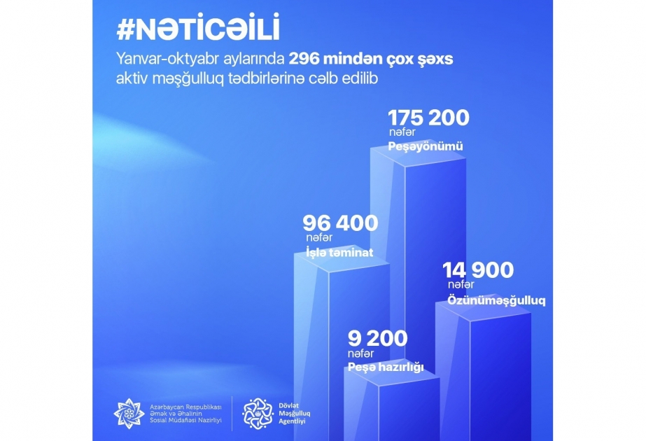 Əmək və Əhalinin Sosial Müdafiəsi Nazirliyinin tabeliyindəki Dövlət Məşğulluq Agentliyi tərəfindən bu ilin yanvar-oktyabr aylarında 296 minə yaxın şəxs aktiv məşğulluq tədbirləri ilə əhatə olunub.