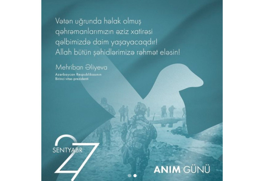 Birinci vitse-prezident Mehriban Əliyeva 27 Sentyabr - Anım Günü ilə əlaqədar sosial şəbəkə hesablarında paylaşım edib.