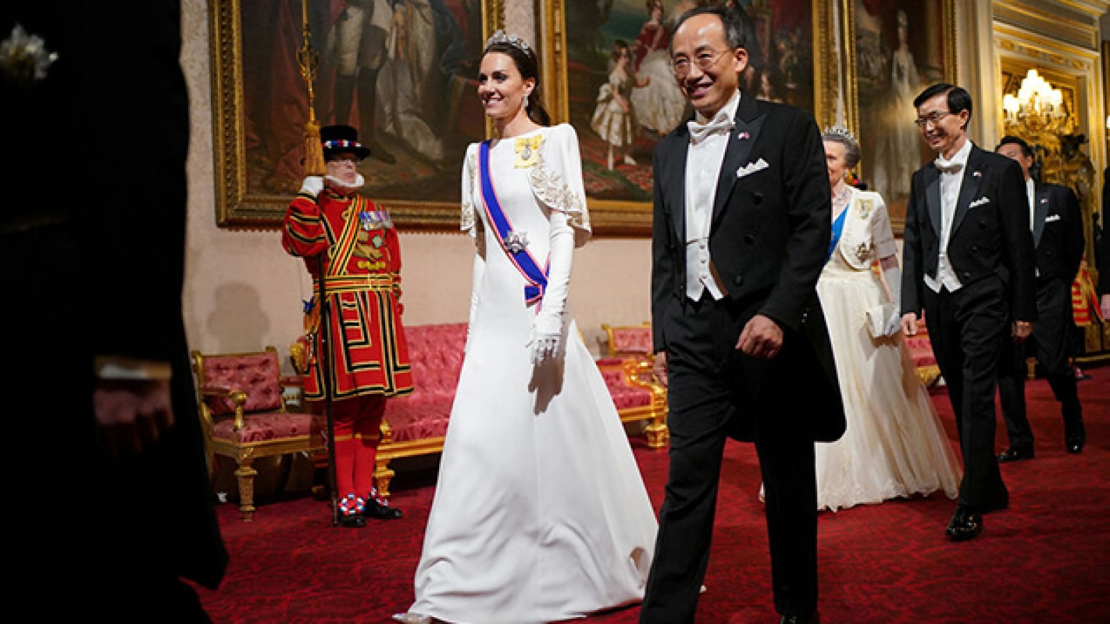 Uels şahzadəsi Şahzadə Uilyam həyat yoldaşı Keyt Middlton Cənubi Koreya Prezidentinin şərəfinə Bukinqem sarayında keçirilən ziyafətdə fərqli tac taxıb.