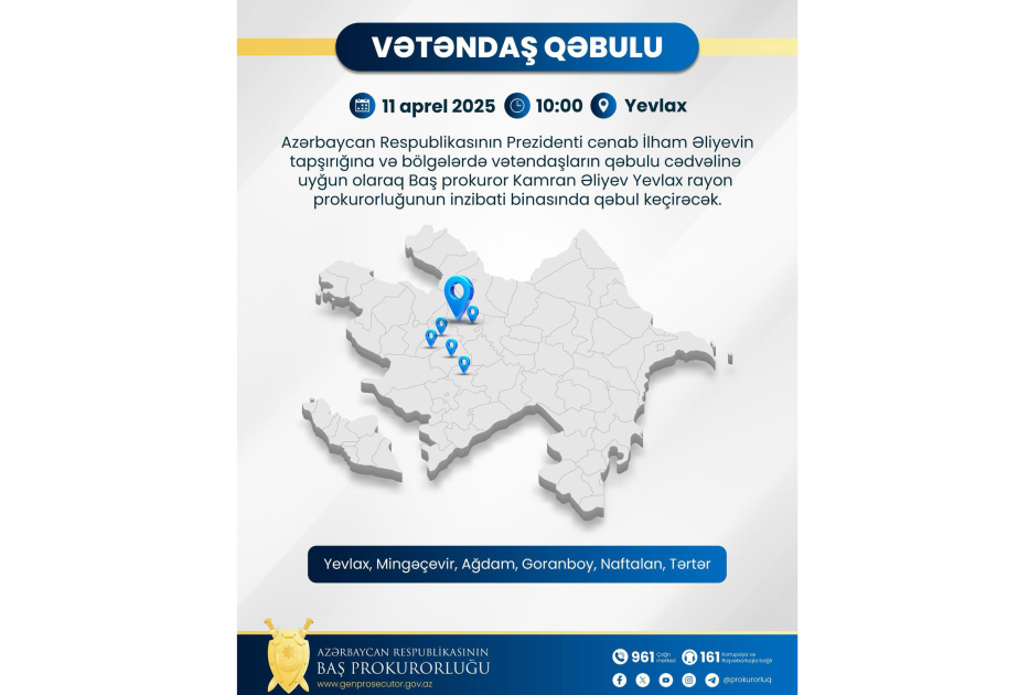 Prezident İlham Əliyevin tapşırığına və bölgələrdə vətəndaşların qəbulu cədvəlinə uyğun olaraq Baş prokuror Kamran Əliyev aprelin 11-i saat 10:00-da Yevlax rayon prokurorluğunun inzibati binasında Yevlax, Ağdam, Goranboy, Naftalan, Tərtər rayon və Mingəçevir şəhər sakinlərinin müraciətlərini dinləyəcək.