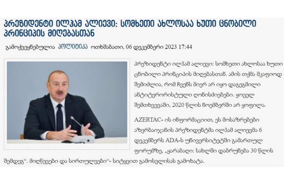 Azərbaycan Respublikasının Prezidenti İlham Əliyevin ADA Universitetində keçirilən “Qarabağ: 30 ildən sonra evə dönüş. Nailiyyətlər və çətinliklər” Forumunda çıxışı zamanı söylədiyi fikirlər Gürcüstan mediasının diqqət mərkəzində olub.