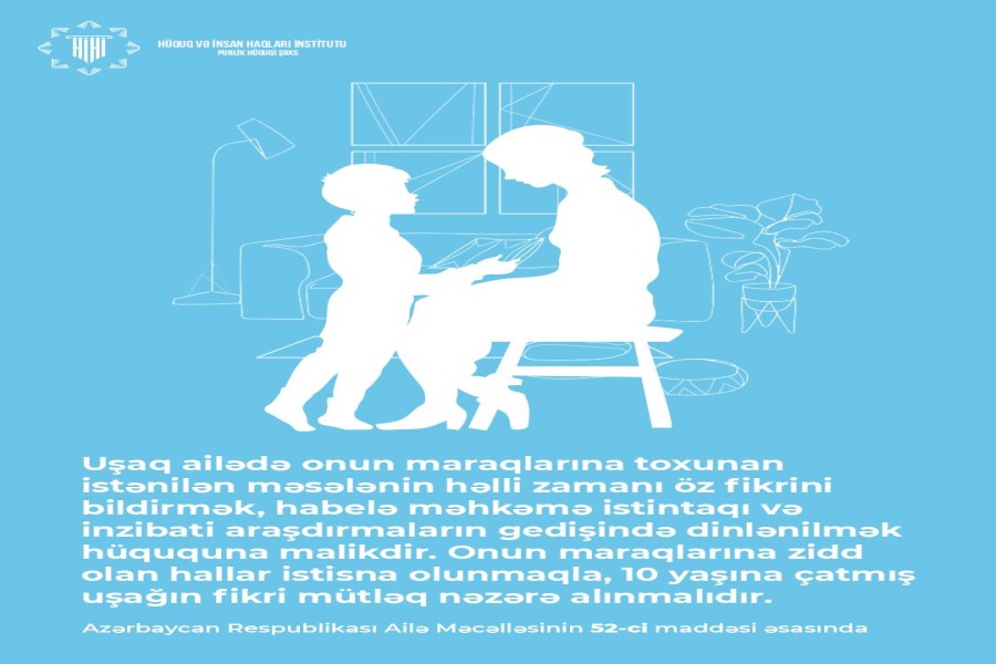 QHT.az xəbər verir ki, məlumata əsasən, Azərbaycanın Ailə Məcəlləsinin 52-ci maddəsinə əsasən, uşaqlar öz maraqlarına toxunan məsələlərin həllində fikir bildirmək hüququna malikdirlər. Uşaqlar, ailə ilə bağlı hüquqi məsələlərdə, xüsusən də məhkəmə proseslərində və araşdırmalarda öz fikirlərini bildirmək hüququna sahibdirlər. Uşaqların fikri, hüquqi və inzibati araşdırmaların gedişatında mütləq nəzərə alınmalıdır.