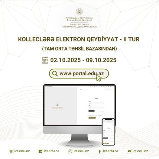 Tam orta təhsil bazasından orta ixtisas təhsili müəssisələrinin boş qalan plan yerlərinə əlavə yerləşdirmə nəticəsində qəbul olunanlar üçün qeydiyyat prosesinə 2 oktyabr saat 11:00-da start veriləcək.