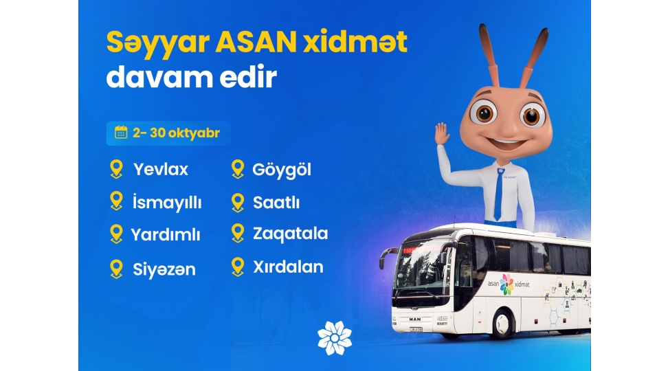 2- 30 oktyabr tarixində Yevlaxda, İsmayıllıda, Yardımlıda, Siyəzəndə, Göygöldə, Saatlıda, Zaqatalada və Xırdalanda vətəndaşlara səyyar xidmət göstəriləcək.