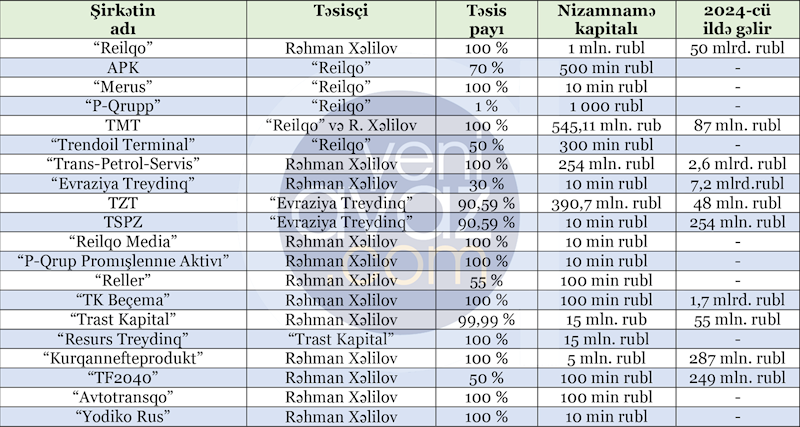 Cədvəldə Rəhman Xəlilova məxsus şirkətlər yer alıb:
