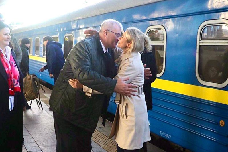 На вокзале ее встретил глава МИД Украины Андрей Сибига.