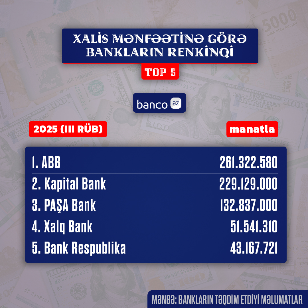 Banco.az 2025-ci ilin III rübü üzrə bankların xalis mənfəətinə görə TOP 5-liyini təqdim edir. Hesabat dövründə ən yüksək mənfəət əldə edən 5 bank bunlar olub:
