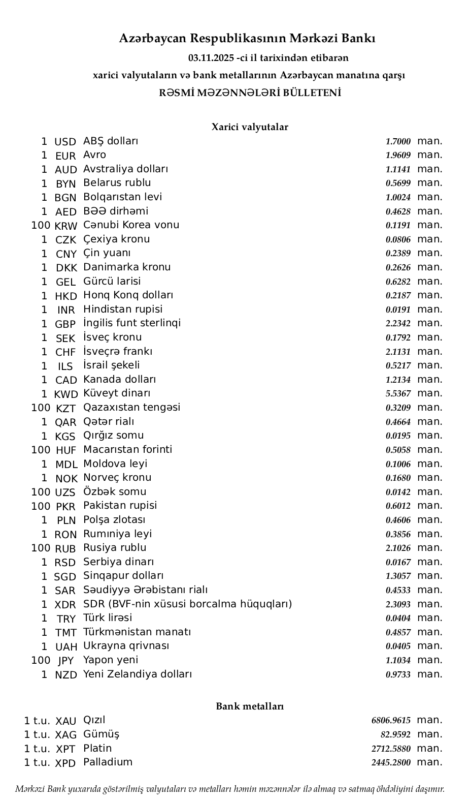 Rəsmi məzənnələr açıqlandı