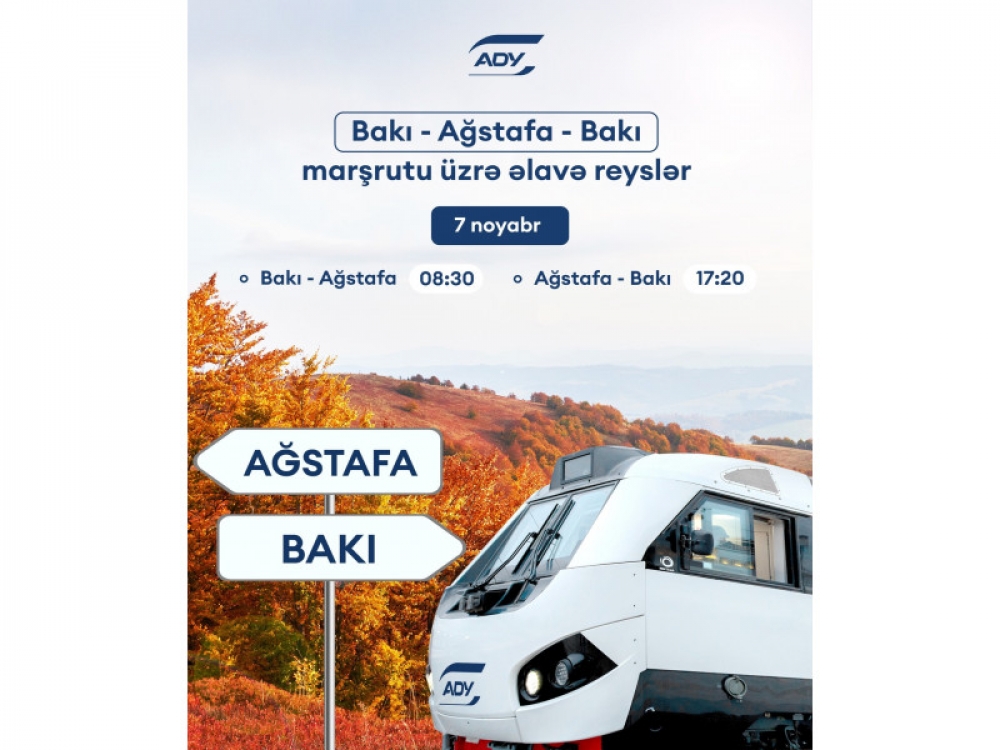 "Azərbaycan Dəmir Yolları" QSC (ADY) noyabrın 7-də Bakı-Ağstafa-Bakı istiqamətində əlavə reyslər həyata keçirəcək.
