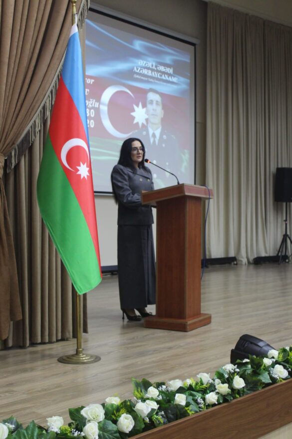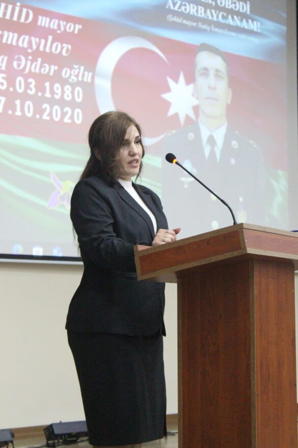 “Zəfər” Şəhid Ailələrinə Dəstək İctimai Birliyinin sədri, Aprel döyüşləri şəhidi, “Murov qartalı” adı ilə tanınan polkovnik-leytenant Raquf Orucovun həyat yoldaşı Sevinc Alızadə çıxışında şəhidlərimizin hər zaman yad edilməsinin mənəvi borcumuz olduğunu deyib, gəncləri qəhrəman şəhid və qazilərimizdən örnək olaraq Azərbaycanımızın suverenliyini əbədi qorumağa çağırıb.