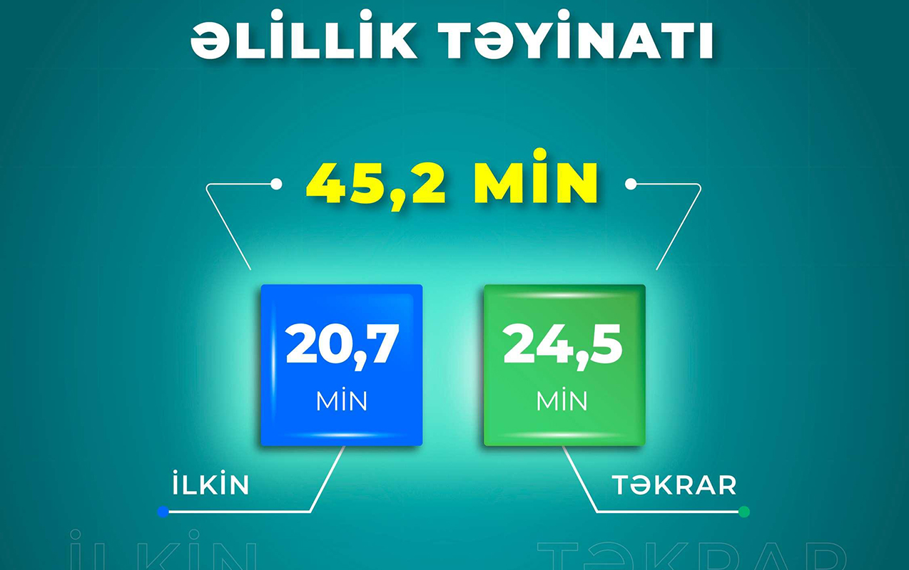 "Cebheinfo.az" xəbər verir ki, onlardan 20,7 min şəxsə ilkin, 24,5 min şəxsə isə təkrar əlillik təyinatı aparılıb.
