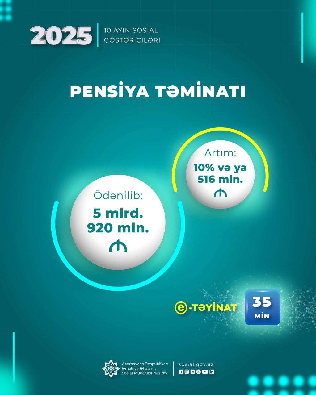 Yanvar-oktyabr aylarında 35 min, elektron pensiya təyinatına başlandığı 2019-cu ilin əvvəlindən 173 min pensiya təyinatı e-sistem üzərindən proaktiv qaydada həyata keçirilib.