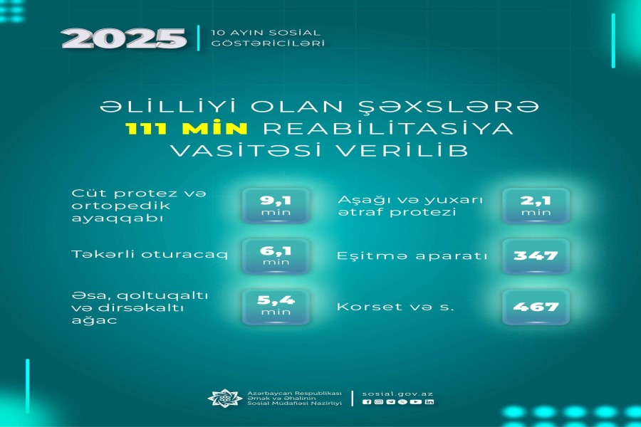 Həmçinin əlilliyi olan şəxslərə 9,1 min cüt protez və yarım cüt ortopedik ayaqqabı, 347 eşitmə aparatı, 467 korset və s. reabilitasiya vasitələri təqdim olunub.