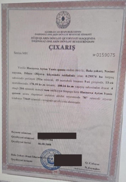 Həmin binanın 13-cü mərtəbəsində G.Hacıbəyliyə xüsusi “xidmətlərinə” görə, “boz kardinal” tərəfindən bağışlanan digər mənzil isə Gültəkinin bacısı Aytən Hacıyevanın adına rəsmiləşdirilib. 178.18 kv.m sahəsi olan, 4 otaqlı mənzildə isə G.Hacıbəyli özü tək yaşayır.