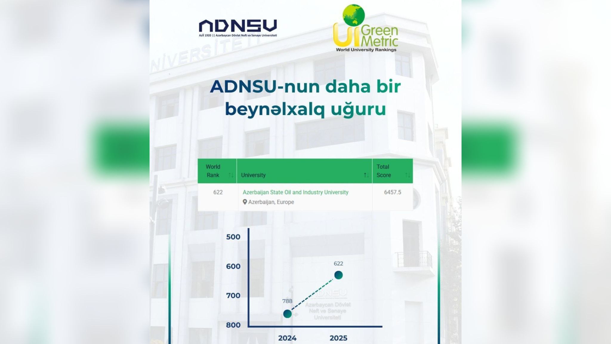 Agentlik tərəfindən açıqlanan yeni nəticələrə əsasən, ADNSU 2024-cü illə müqayisədə 2025-ci ildə 6457.5 bal toplayaraq (ötən il 5640 bal olub) 788-ci sıradan 622-ci yerə yüksəlib. Bu uğur universitetin ətraf mühitə məsuliyyət, resursların səmərəli idarə olunması və dayanıqlı akademik inkişaf sahələrində həyata keçirdiyi ardıcıl fəaliyyətlərin göstəricisidir.