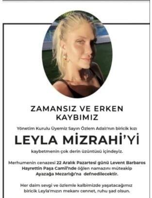 Milli.Az xəbər verir ki, Özlem Adalının qızı və iş adamı Camal Özgörkeyin qardaşı qızı olan Leyla Mizrahi cəmi 6 ay əvvəl övlad dünyaya gətirmişdi. Heç bir məlum xəstəliyi olmayan gənc qadının yuxuda dünyasını dəyişməsi yaxınlarını yasa boğub.