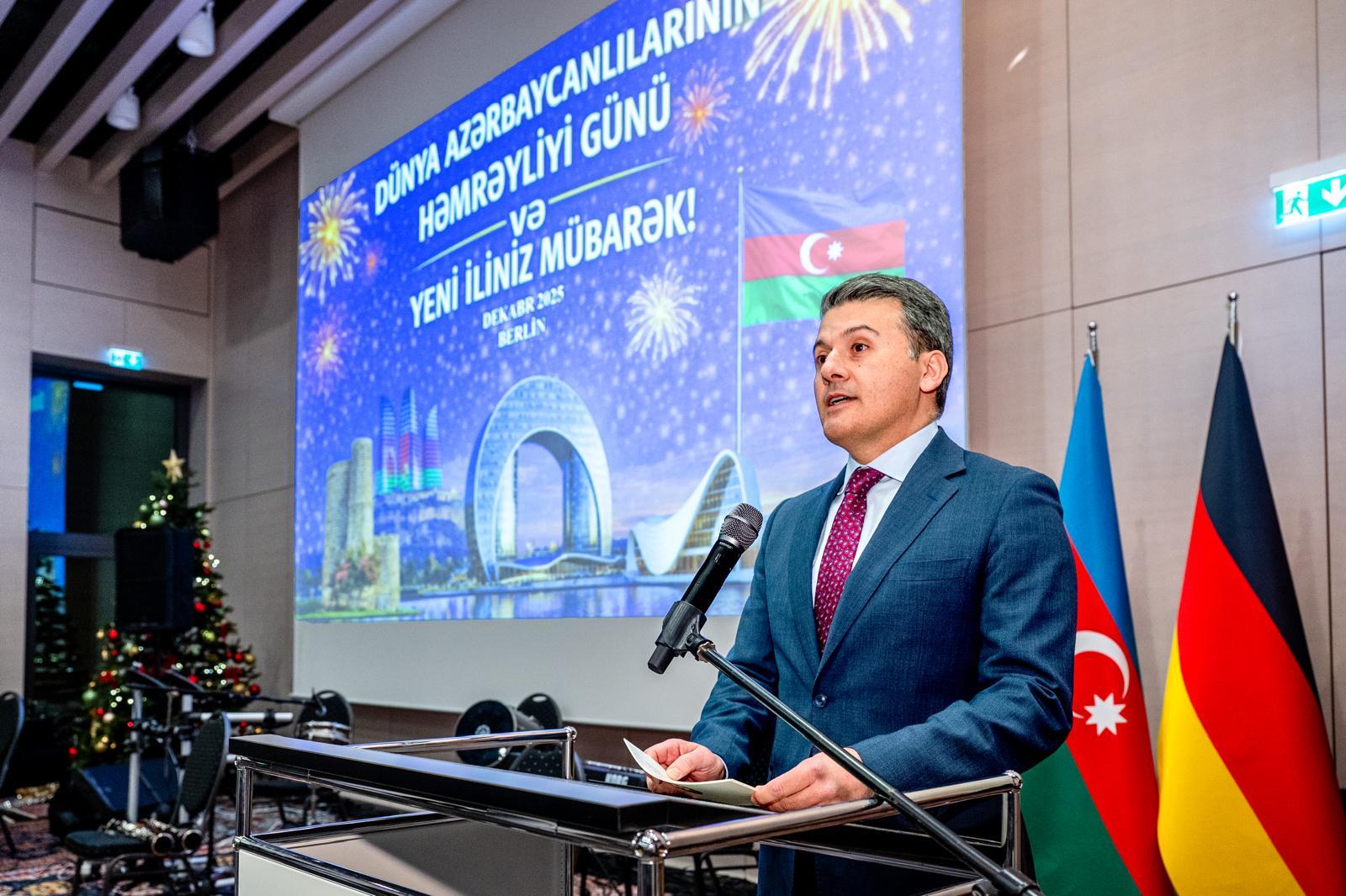 Azərbaycanın Almaniyadakı səfiri Nəsimi Ağayev tədbirdə çıxış edərək, əlamətdar bayramlar münasibətilə təbriklərini çatdırıb, Dünya Azərbaycanlılarının Həmrəyliyi Gününün milli kimliyimizi, tarixi yaddaşımızı və birliyimizi ifadə etdiyini vurğulayıb. Bu ilin ölkəmizdə “Konstitusiya və Suverenlik İli” kimi qeyd olunduğunu diqqətə çatdıran diplomat, Azərbaycanın öz suverenliyini bütün ərazisində tam təmin etmiş müstəqil və güclü dövlət olduğunu bildirib. “2025-ci il son 224 il ərzində ilk dəfə olaraq Azərbaycan ərazisində heç bir xarici silahlı qüvvənin mövcud olmadığı il kimi tarixə düşdü. Bu da dövlətimizin tam suverenliyinin və müstəqilliyinin bariz göstəricisidir”, - deyə Nəsimi Ağayev xüsusi vurğulayıb.