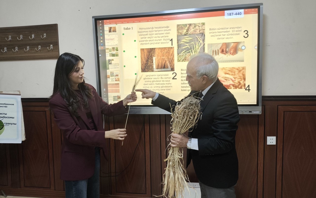 Açıq dərsdə BDU-nun Biologiya fakültəsinin magistr tələbəsi Aysun Əsədlinin “Məhsuldarlığın təyini metodikası” mövzusunda təqdimatı dinlənilib. Təqdimatda bitki zərərlərinin araşdırılması zamanı görüləcək tədbirlər, onların ardıcıllığı, diqqət yetirilməli əsas məqamlar və digər vacib məsələlər ətraflı izah olunub.