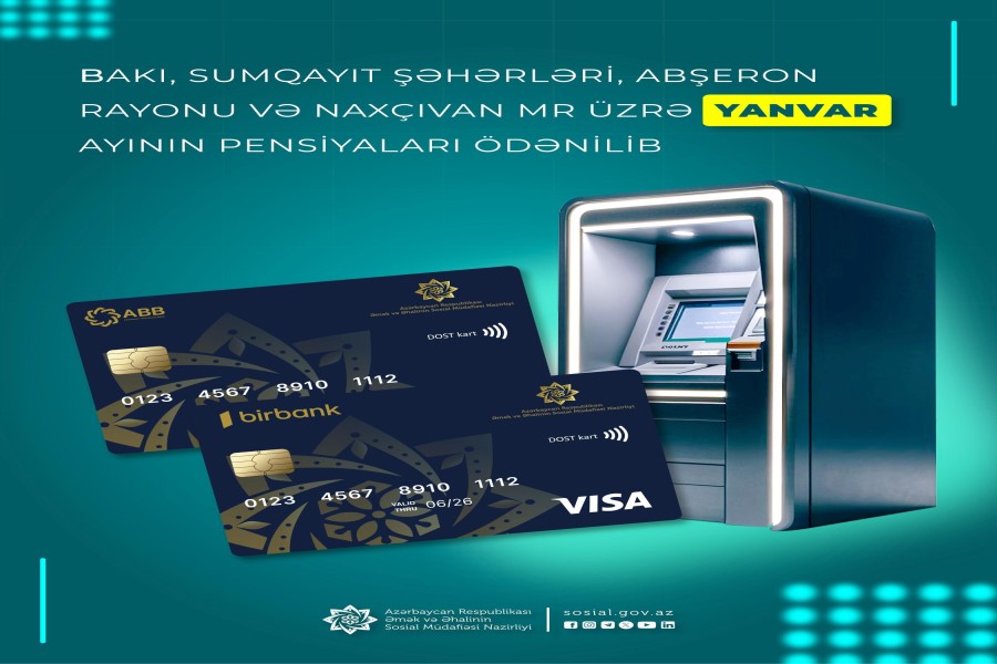 Əmək və Əhalinin Sosial Müdafiəsi Nazirliyinin tabeliyində Dövlət Sosial Müdafiə Fondu tərəfindən Bakı, Sumqayıt şəhərləri və Abşeron rayonu üzrə yanvar ayının pensiyaları ödənilib.