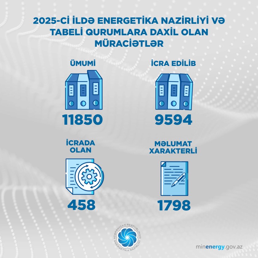 2025-ci il ərzində Energetika Nazirliyi və tabeli qurumlara 11850 vətəndaş müraciəti daxil olub.