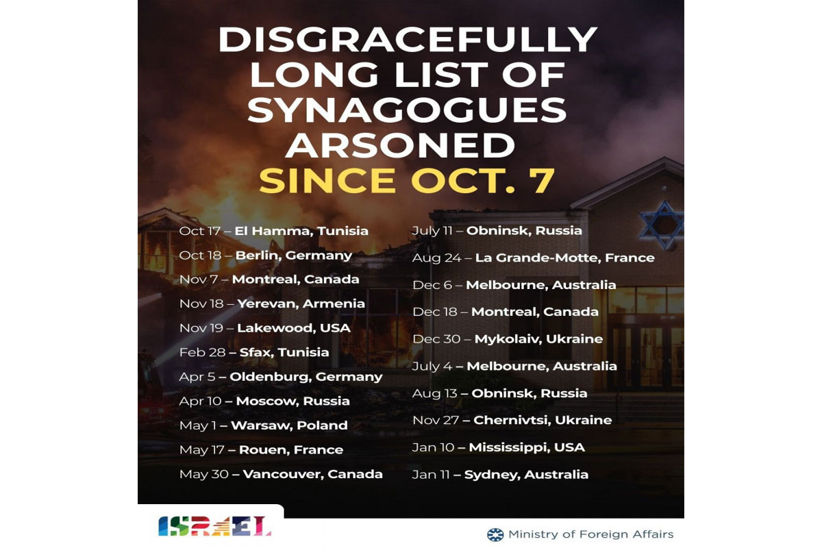 İsrail Xarici İşlər Nazirliyi 2023-cü ildə baş vermiş 7 oktyabr hadisələrindən sonra sinaqoqlara qarşı hücumların qeydə alındığı ölkələrin siyahısını dərc edib.