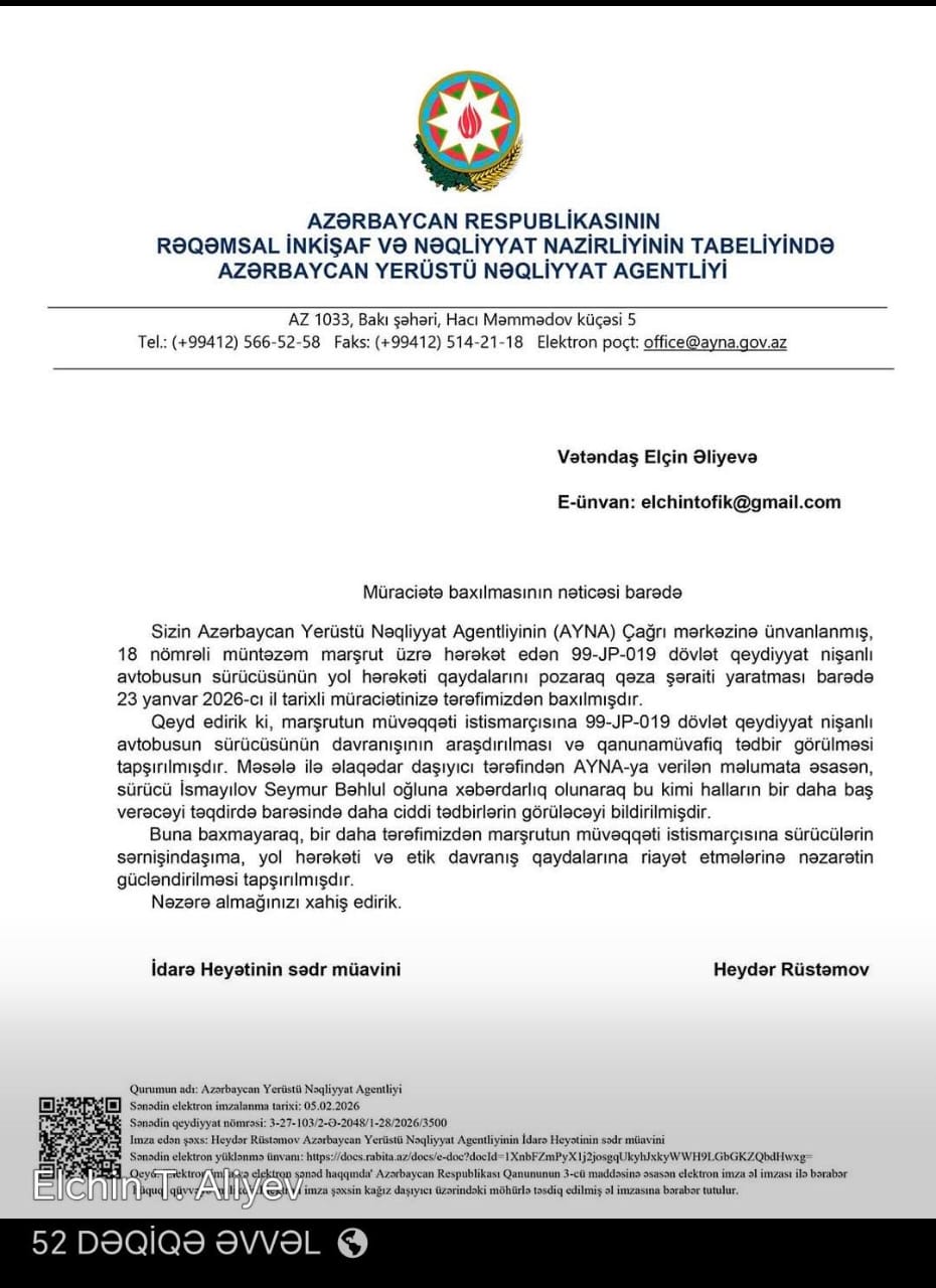 Memar Elçin Əliyev Azərbaycan Yerüstü Nəqliyyat Agentliyinə (AYNA) göndərdiyi məktuba agentlikdən gələn kobud və laqeyd cavabla bağlı status paylaşıb.