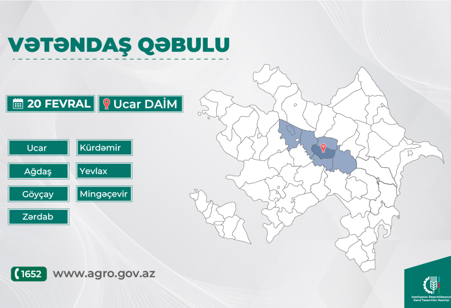 Kənd təsərrüfatı naziri Məcnun Məmmədov fevralın 20-də saat 09:00-da Ucar Dövlət Aqrar İnkişaf Mərkəzinin (DAİM) inzibati binasında Ucar, Ağdaş, Göyçay, Kürdəmir, Yevlax, Mingəçevir və Zərdab rayonlarından olan vətəndaşları qəbul edəcək.