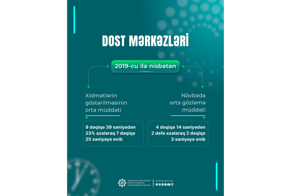 Əmək və Əhalinin Sosial Müdafiəsi Nazirliyinin İctimaiyyətlə əlaqələr şöbəsindən AZƏRTAC-a verilən məlumata görə, ilk DOST mərkəzinin fəaliyyətə başladığı 2019-cu ilə nisbətən DOST mərkəzlərində vətəndaşlara xidmətlərin göstərilməsinin orta müddəti 9 dəqiqə 39 saniyədən 23 faiz azalaraq 7 dəqiqə 25 saniyəyə, vətəndaşların növbədə orta gözləmə müddəti 4 dəqiqə 14 saniyədən 2 dəfə azalaraq 2 dəqiqə 3 saniyəyə enib.