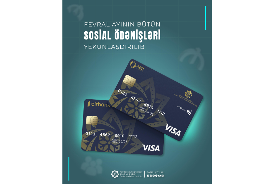 Əmək və Əhalinin Sosial Müdafiəsi Nazirliyinin tabeliyində Dövlət Sosial Müdafiə Fondu tərəfindən bu gün fevral ayının müavinət, təqaüd və ünvanlı dövlət sosial yardımları ödənilib.