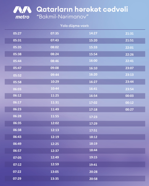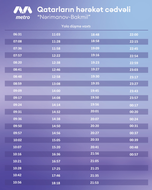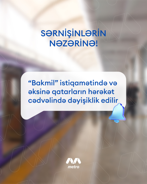 Odur ki, martın 4-dən “Bakmil” stansiyasına və əks istiqamətə qatarların hərəkət cədvəlinə dəyişikliklər tətbiq edilir. Sınaq müddətində “Nərimanov– Bakmil” sahəsində hərəkət edən sərnişinlər üçün yenilənmiş qrafik təqdim olunur.