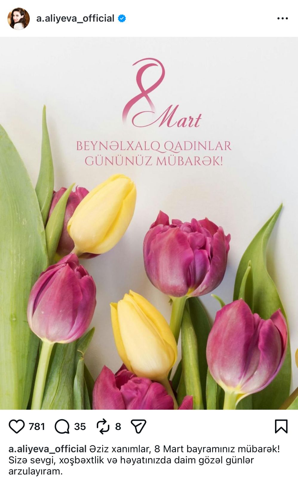 Prezident İlham Əliyevin gəlini Alyona Əliyeva 8 Mart – Beynəlxalq Qadınlar Günü münasibətilə paylaşım edib.