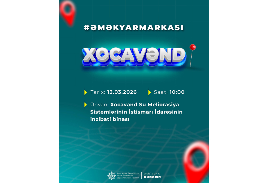Əmək və Əhalinin Sosial Müdafiəsi Nazirliyinin tabeliyində Dövlət Məşğulluq Agentliyi və SOCAR-ın Qaz İxrac İdarəsinin birgə təşkilatçılığı ilə Xocavənd şəhərində əmək yarmarkası keçiriləcək.