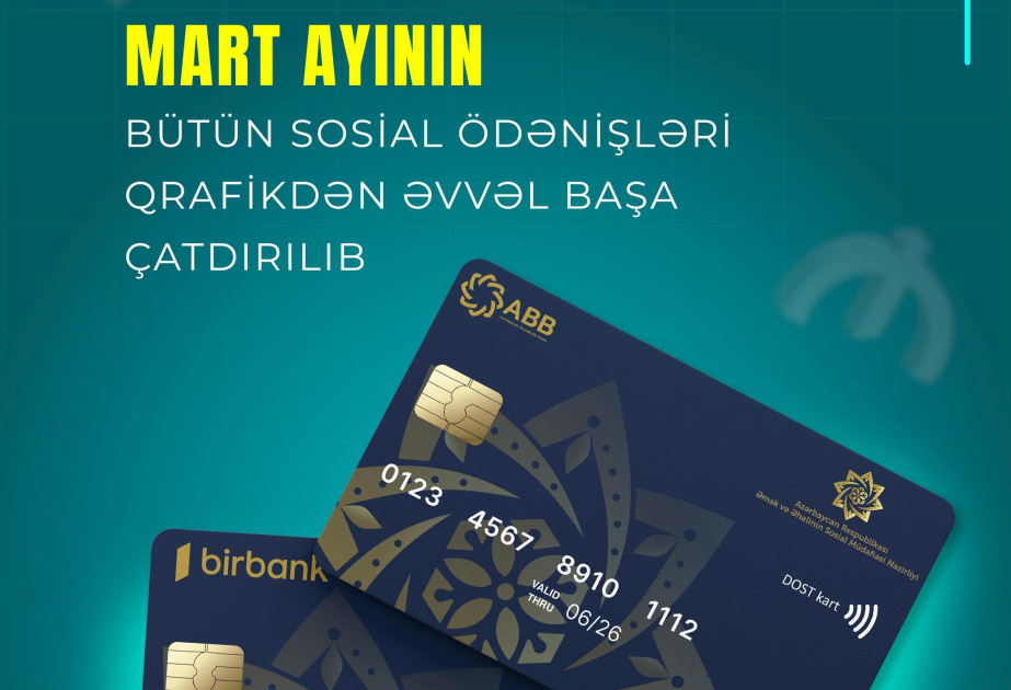 Əmək və Əhalinin Sosial Müdafiəsi Nazirliyinin tabeliyində Dövlət Sosial Müdafiə Fondu tərəfindən qarşıdan gələn bayramlarla əlaqədar olaraq bu gün mart ayının müavinət, təqaüd və ünvanlı sosial yardımları da ödənilib.