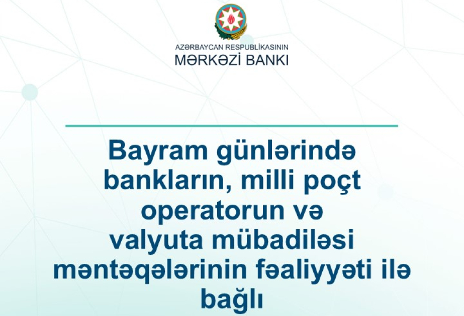 Martın 20–30 tarixlərində olan qeyri-iş günlərində bankların və “Azərpoçt” MMC-nin bəzi filial və şöbələri, habelə valyuta mübadilə məntəqələri fəaliyyət göstərəcəklər.
