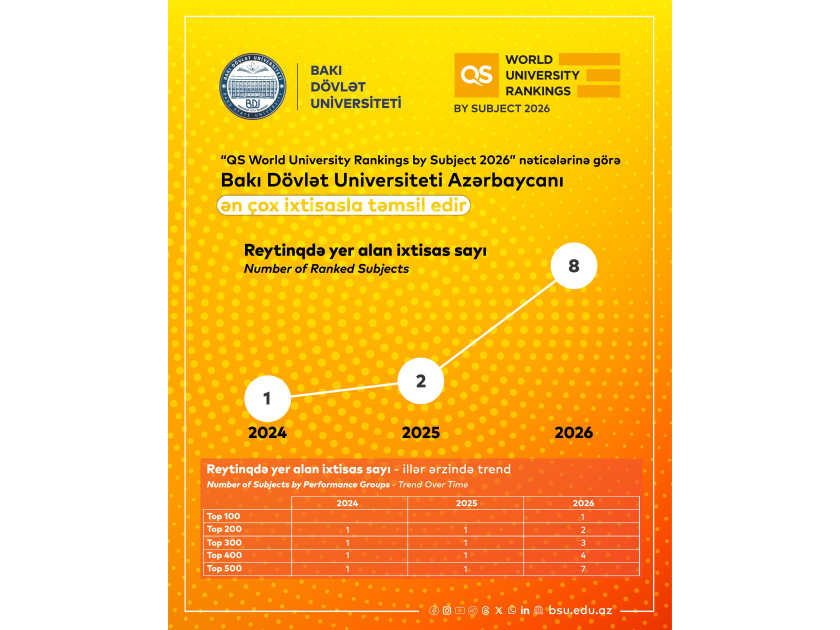 Dünyanın nüfuzlu reytinq təşkilatı “Quacquarelli Symonds” (QS) tərəfindən “QS World University Rankings by Subject 2026” nəticələri elan olunub. Nəticələrə əsasən, Bakı Dövlət Universiteti (BDU) böyük uğura imza ataraq cari ildə ilk dəfə olaraq 2 geniş ixtisas kateqoriyası üzrə reytinq siyahısında yer alıb.
