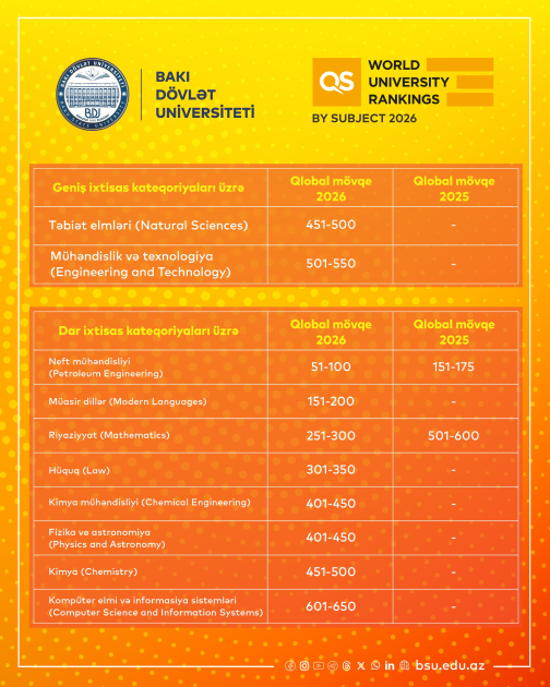 Qeyd olunmalıdır ki, “QS World University Rankings by Subject 2026” nəticələrinə əsasən, BDU geniş ixtisas kateqoriyaları üzrə təbiət elmləri (“Natural Sciences”) sahəsində 401–500, mühəndislik və texnologiya (“Engineering and Technology”) sahəsində isə 501–550-ci diapazonda qərarlaşıb. Bununla yanaşı, dar ixtisas sahələri üzrə BDU neft-qaz mühəndisliyi (“Petroleum Engineering”) sahəsində 51–100-cü, müasir dillər (“Modern Languages”) üzrə 151–200-cü, riyaziyyat (“Mathematics”) üzrə 251–300-cü, Hüquq (“Law”) üzrə 301–350-ci, kimya mühəndisliyi (“Chemical Engineering”) üzrə 401–450-ci, fizika və astronomiya (“Physics and Astronomy”) üzrə 401–450-ci, kimya (“Chemistry”) üzrə 451–500-cü, kompüter elmləri və informasiya sistemləri (“Computer Science and Information Systems”) üzrə isə 601–650-ci diapazonda yer alıb.