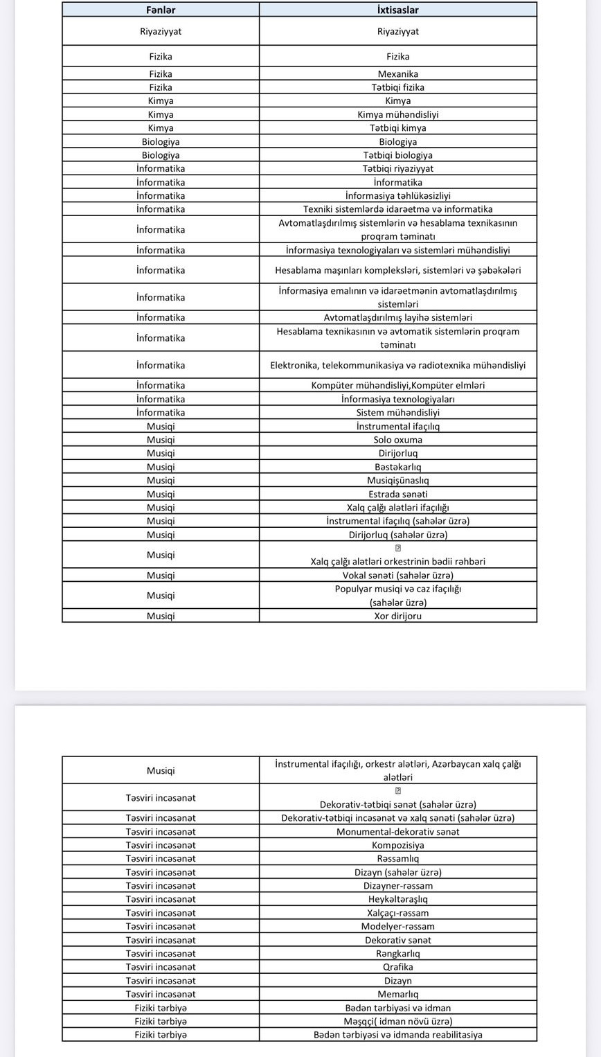 Bildirilib ki, siyahıda qeyd olunan qeyri-pedaqoji ixtisaslara sahib şəxslər müəllimlərin işə qəbulu üzrə müsabiqədə iştirak edə bilərlər.