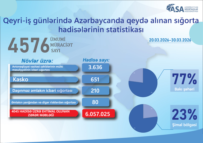 Azərbaycan Sığortaçılar Assosiasiyasının yerli sığorta bazarı iştirakçılarından aldığı bu günə olan son dəqiq məlumatlara görə, 20-30 mart 2026-cı il tarixlərdə baş vermiş sığorta hadisələri ilə bağlı 8 qeyri-həyat sığorta şirkətinə ümumilikdə 4576 sığortalı müraciəti daxil olub. Bu müraciətlərin 3636-sı “Avtonəqliyyat vasitəsi sahiblərinin mülki məsuliyyətinin icbari sığortası” növü, 651-i “Kasko” (“Avtonəqliyyat vasitələrinin sığortası”) sığorta növü, 210-u “Daşınmaz əmlakın icbari sığortası” növü, 80-i isə “Əmlakın yanğından və digər risklərdən sığortası” növü üzrə baş vermiş sığorta hadisələri ilə bağlı olub.