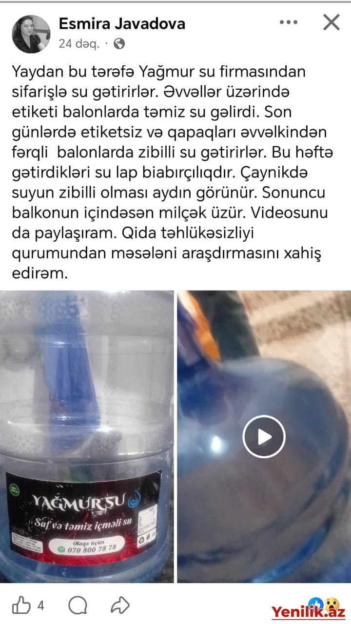 “Yaydan etibarən “Yağmur” su firmasından sifarişlə su gətirirlər. Əvvəllər üərində etiketi olan balonlarda təmiz su gəlirdi. Son günlərdə etiketsiz və qapaqları əvvəlkindən fərqli balonlarda zibilli su gətirirlər.