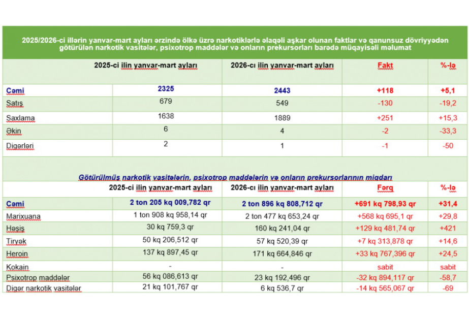 Təhlil göstərir ki, 2025-ci ilin yanvar-mart ayı ilə müqayisədə cari ilin müvafiq dövrü ərzində narkotik vasitələrin və psixotrop maddələrin qanunsuz dövriyyəsi ilə bağlı hüquq-mühafizə orqanları tərəfindən aşkarlanan faktların ümumi sayı 118, satış məqsədi olmadan qanunsuz əldə edilib-saxlanılması ilə əlaqədar faktların sayı 251 fakt, qanunsuz dövriyyədən çıxarılmış narkotiklərin çəkisi 691 kiloqram 798,93 qram artıb, narkotiklərin qaçaqmalçılıq yolu ilə ölkə ərazisinə gətirilməsi ilə bağlı faktların sayı 14 fakt, qrup halında olan cinayətlərin sayı 2 fakt, narkotik xassəli bitkilərin qanunsuz kultivasiya edilməsi ilə bağlı faktlatın sayı 2, digər cinayətlərlə əlaqədar faktların sayı 1 fakt, məsuliyyətə cəlb olunmuş şəxslərin sayı 24, məsuliyyətə cəlb edilmiş xarici ölkə vətəndaşlarının sayı isə 15 nəfər azalıb.