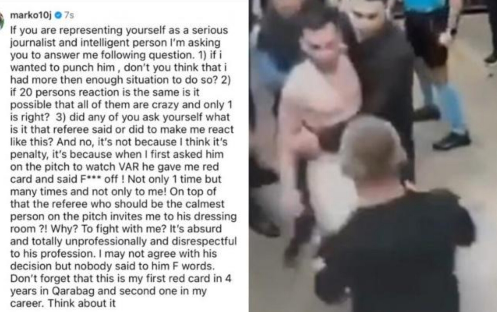 "Football-plus.az" xəbər verir ki, təcrübəli futbolçu “Qafqazinfo”nun instaqram hesabındakı paylaşımına şərh yazaraq, hakimə hücum çəkməsi ilə bağlı görüntülərə reaksiya verib.