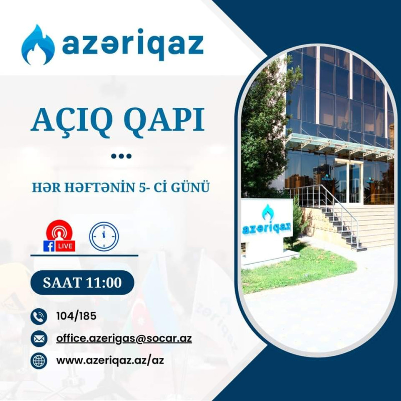 “Azəriqaz” İB-nin inzibati binasında növbəti “Açıq qapı” aksiyası 23 fevral saat 11:00-da başlayacaq. Aksiya "Facebook" sosial şəbəkəsi üzərindən canlı yayımlanacaq.