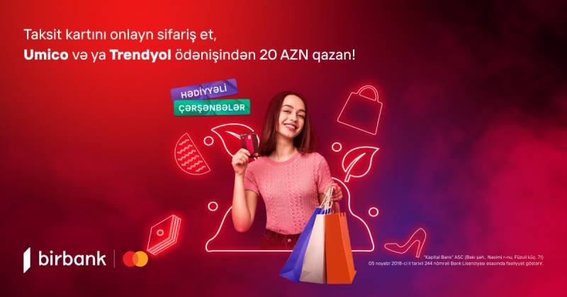 13-19 mart 2024-cü il tarixlərində Birbank Cashback Mastercard taksit kartını onlayn olaraq əldə edən müştərilər 1 aprel 2024-cü il tarixinədək “Trendyol” və “Umico Market” kateqoriyaları üzrə ilk birdəfəlik 50 AZN və üzəri nağdsız əməliyyatları həyata keçirərək 20 AZN qazanacaqlar. Manset.az xəbər verir ki, qazanılan məbləğ ödəniş edildikdən dərhal sonra müştərinin keşbek hesabına əlavə ediləcək. Onu da qeyd edək ki, fürsətlər taksit, POS terminal və ya onlayn ödənişlərə şamil olunur.