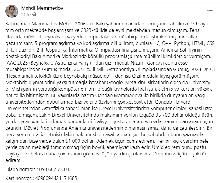 Bu barədə o, sosial şəbəkə hesabında paylaşım edib. Məsələ ilə bağlı ətraflı məlumat əldə etmək üçün Mehdinin özü ilə əlaqə saxladıq.
