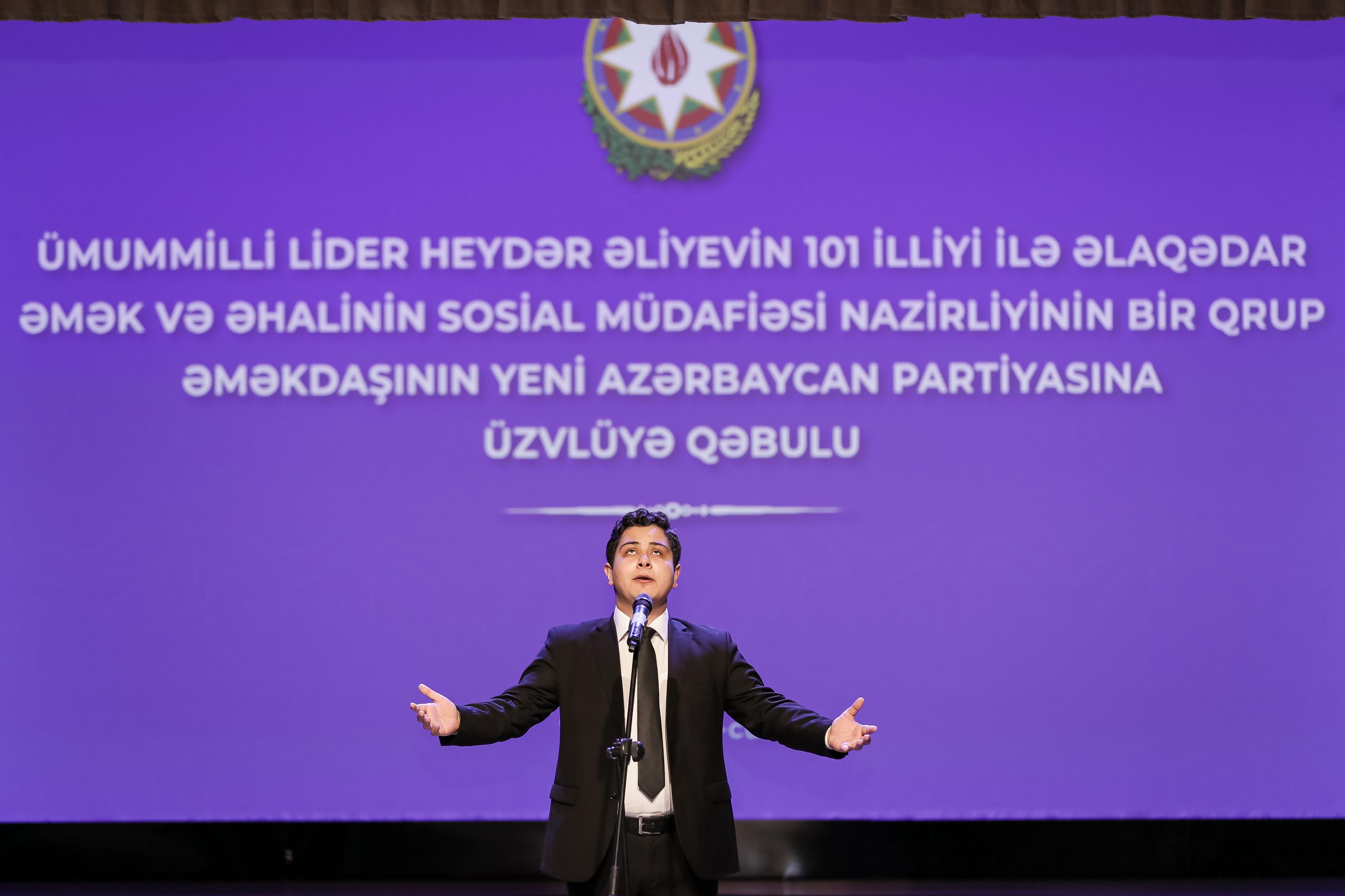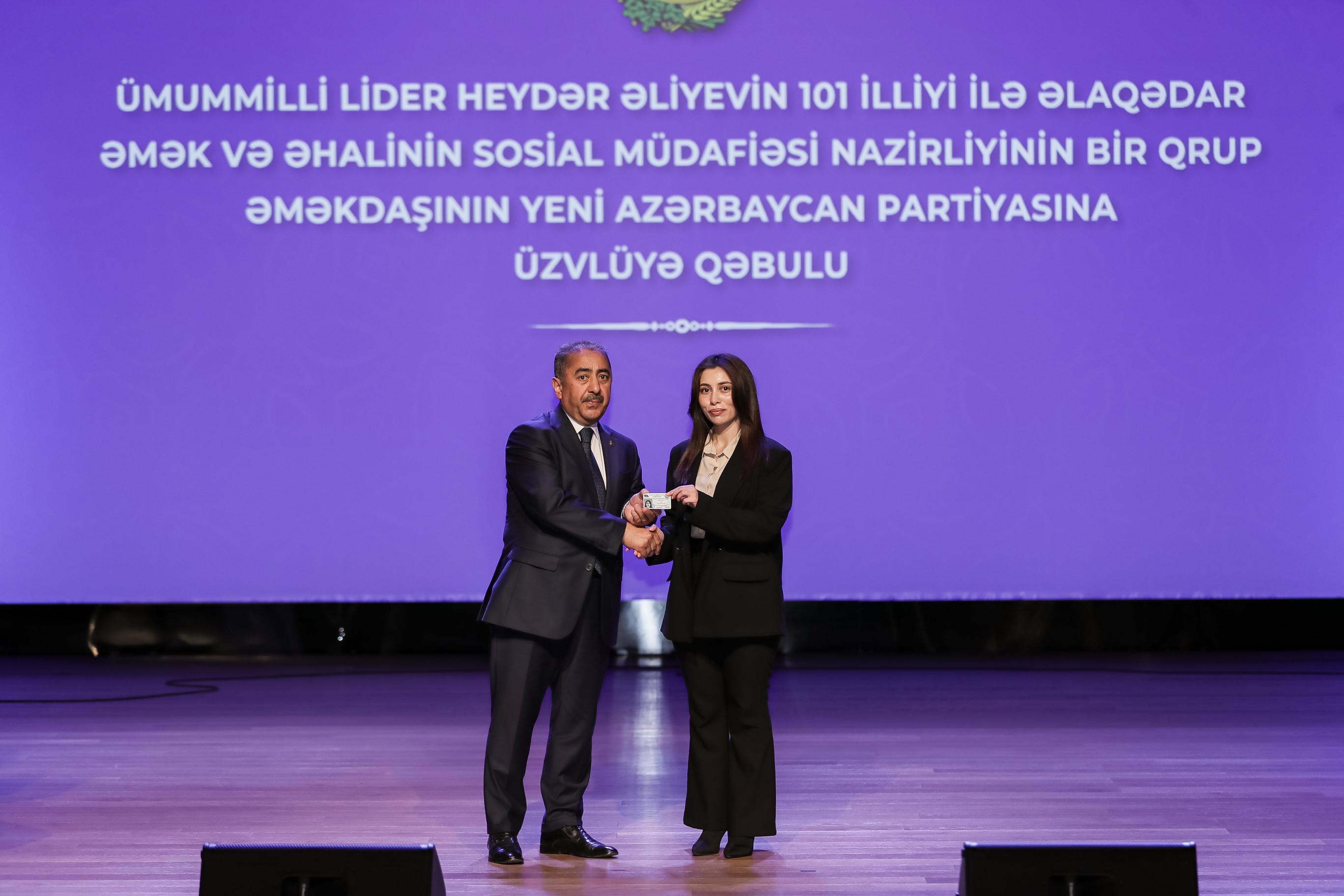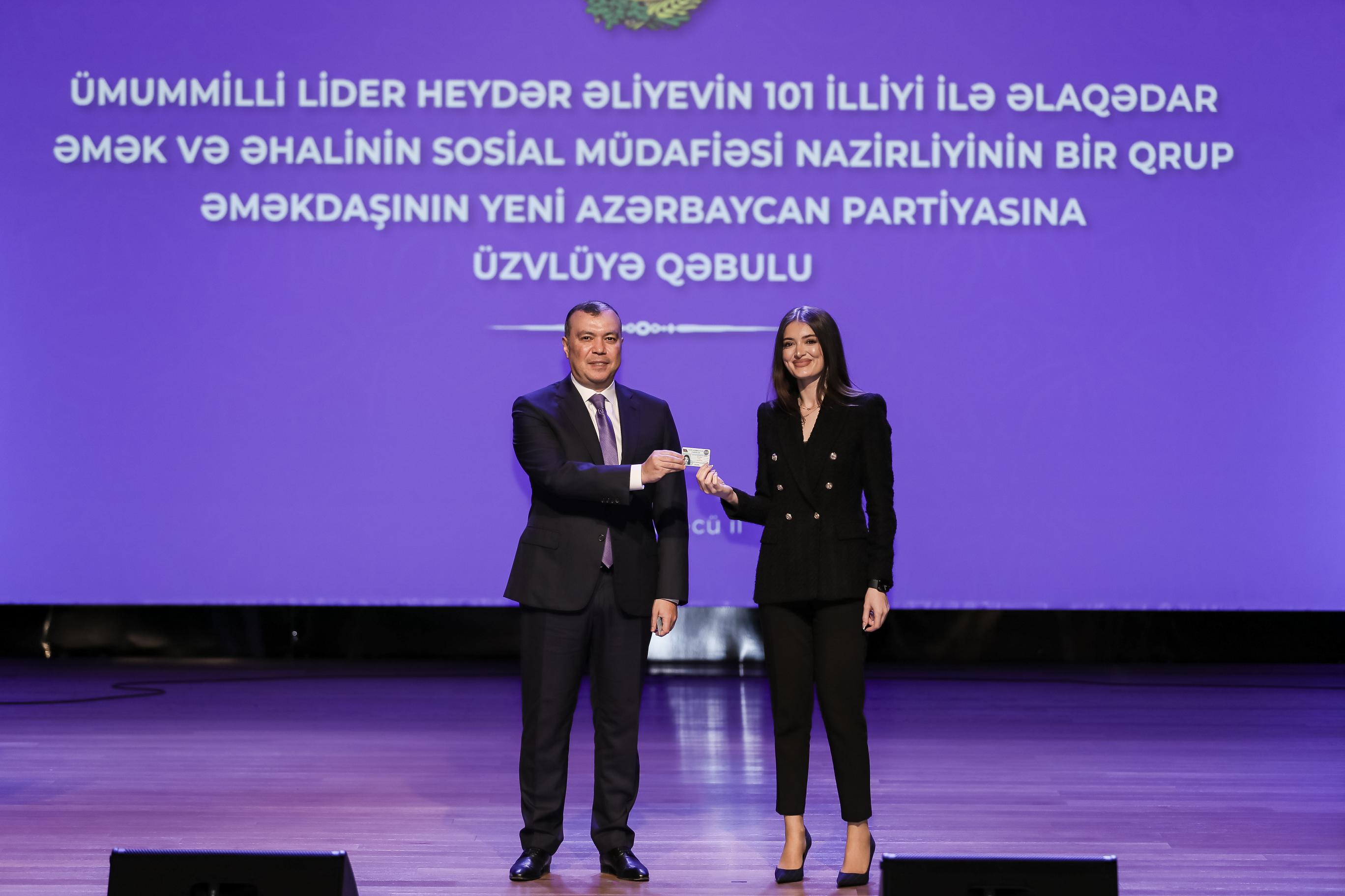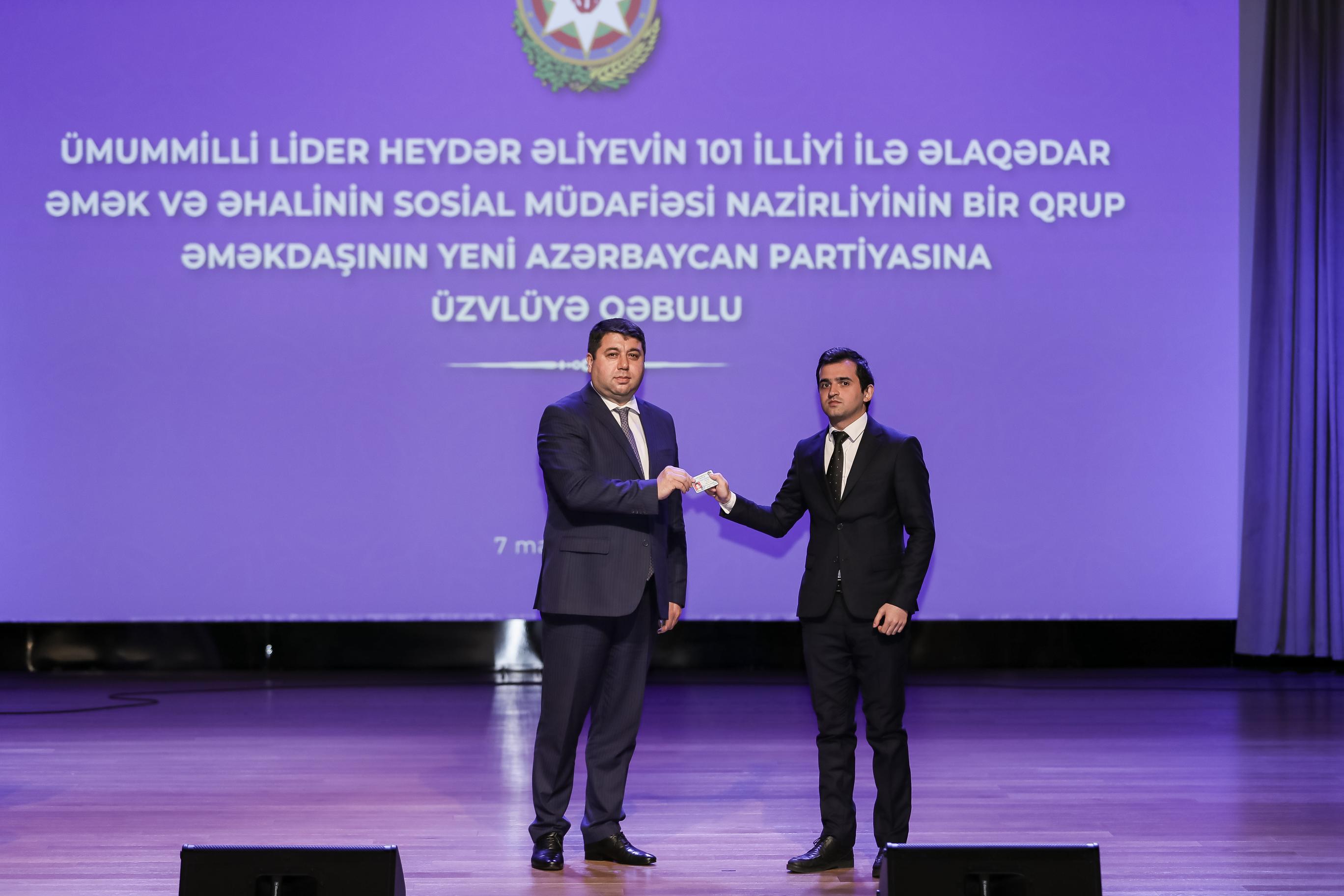 Ümummilli Lider Heydər Əliyevin anadan olmasının 101 illiyi ilə əlaqədar Əmək və Əhalinin Sosial Müdafiəsi Nazirliyinin 123 əməkdaşı müraciətləri əsasında Yeni Azərbaycan Partiyası (YAP) sıralarına qəbul edilərək onlara Partiyanın üzvlük vəsiqələri təqdim edilib.