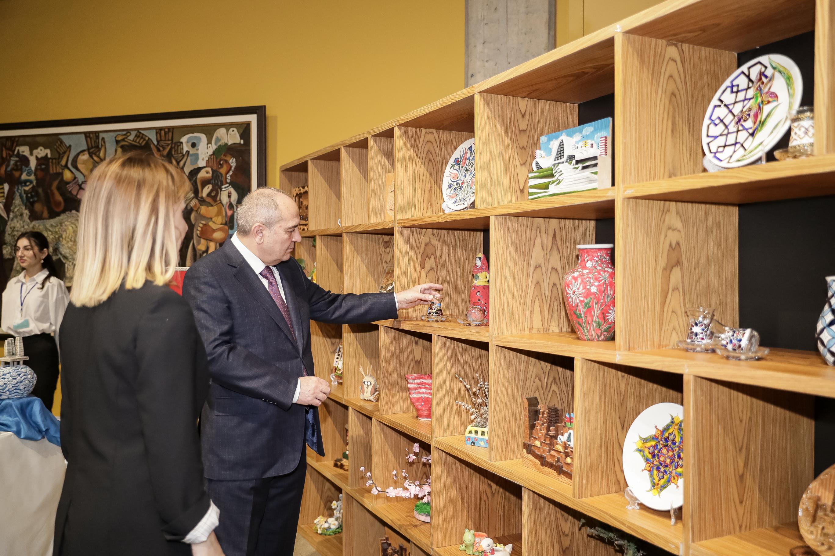 İştirakçılar Mərkəzdə təlimlərə cəlb olunmuş həssas qruplara aid şəxslərin əl işlərindən ibarət sərgi ilə tanış olublar.