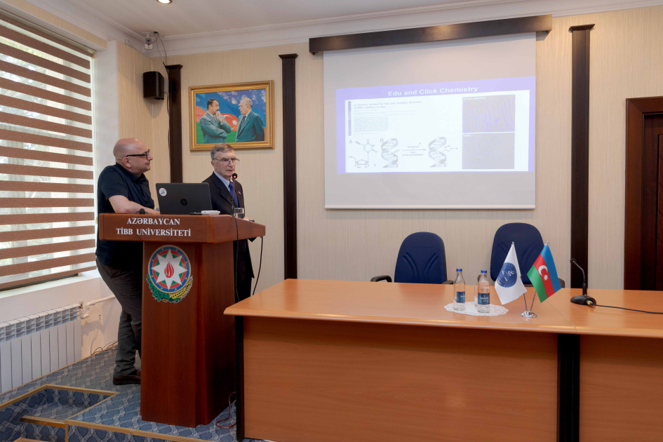 Sonra Nobel mükafatçısının universitetin akt zalında tələbə və müəllim heyəti üçün “Xərçəng xəstəliyinin müalicəsində EdU-nun (5-ethynyl-2'-deoxyuridine) tətbiqi” mövzusunda mühazirəsi dinlənilib. Mühazirədə EdU-nun insan genomuna təsiri, mədəaltı vəzin, mərkəzi sinir sistemi xərçənginin müalicəsində effekti ilə bağlı elmi araşdırmaların nəticələrinə istinad olunub.