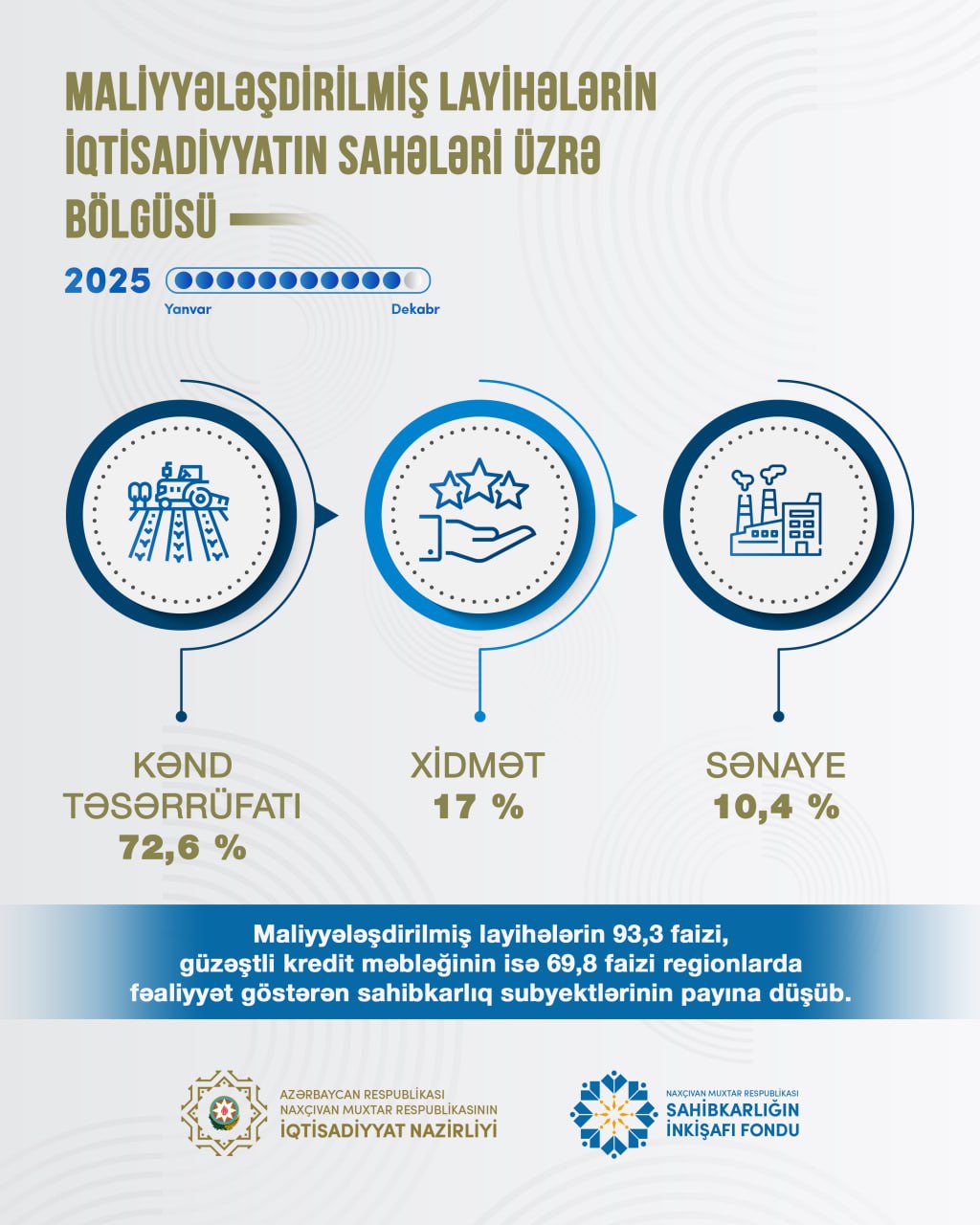 Hesabat dövründə maliyyələşdirilən layihə sayının 72,6 faizi kənd təsərrüfatı, 17 faizi xidmət, 10,4 faizi isə sənaye sahələrinə yönəldilib. Layihələrin 93,3 faizi, güzəştli kredit məbləğinin isə 69,8 faizi regionlarda fəaliyyət göstərən sahibkarlıq subyektlərinin payına düşüb.